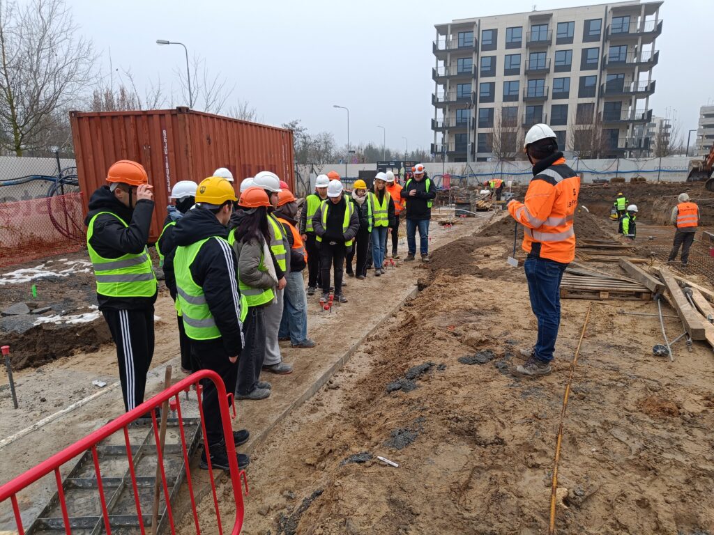 W pierwszych dniach grudnia uczniowie klasy 4a Technikum Budownictwa mieli okazję uczestniczyć w wyjątkowej wycieczce edukacyjnej na plac budowy, zorganizowanej przez firmę Lafrentz. Podczas wizyty młodzież mogła zobaczyć codzienną pracę w branży budowlanej – od pierwszych etapów realizacji inwestycji, aż po najbardziej zaawansowane procesy.