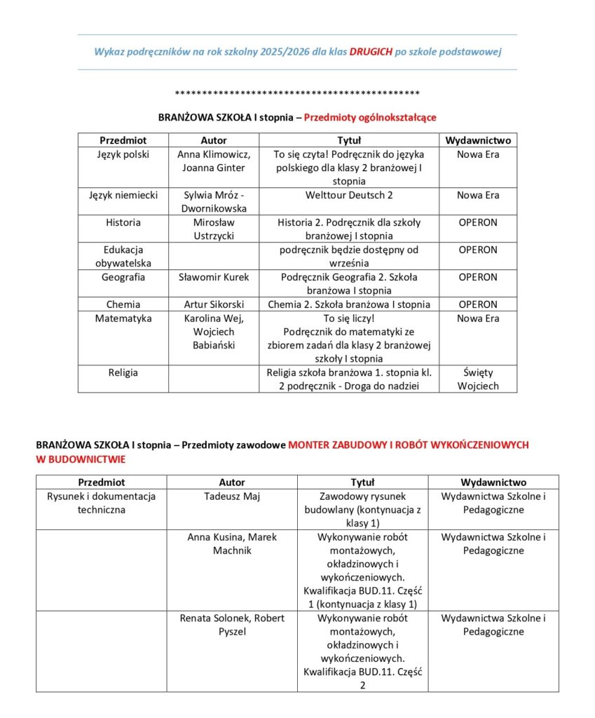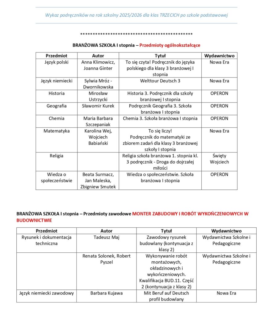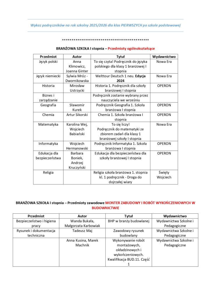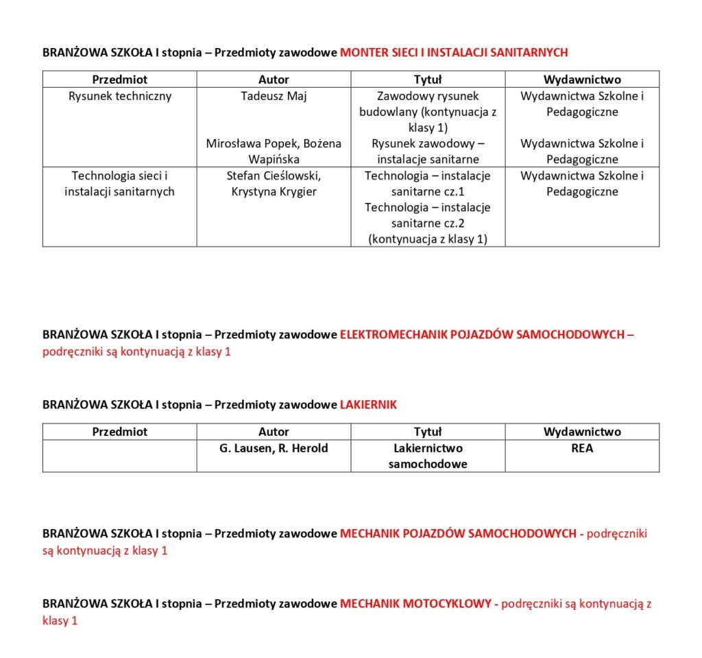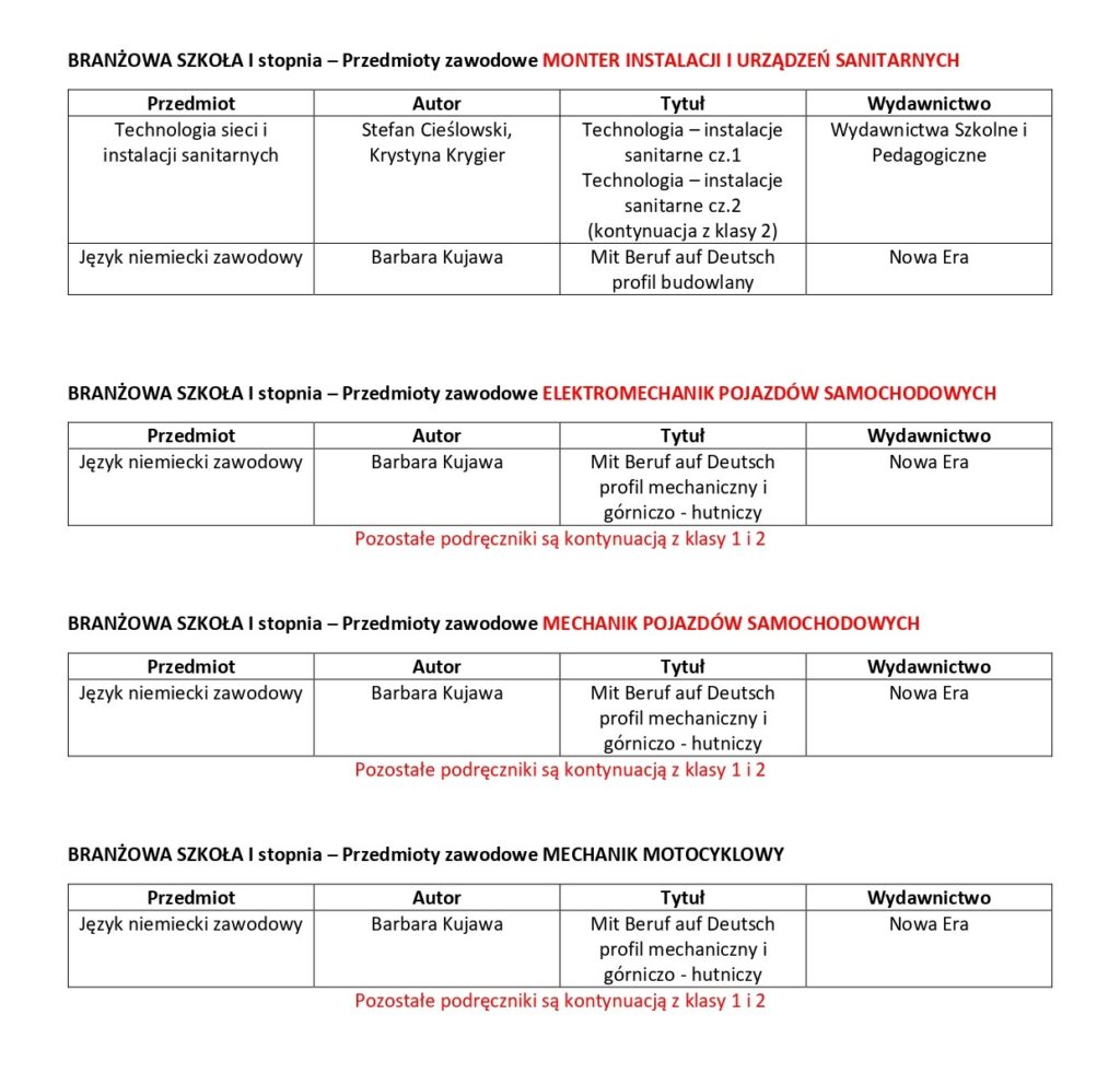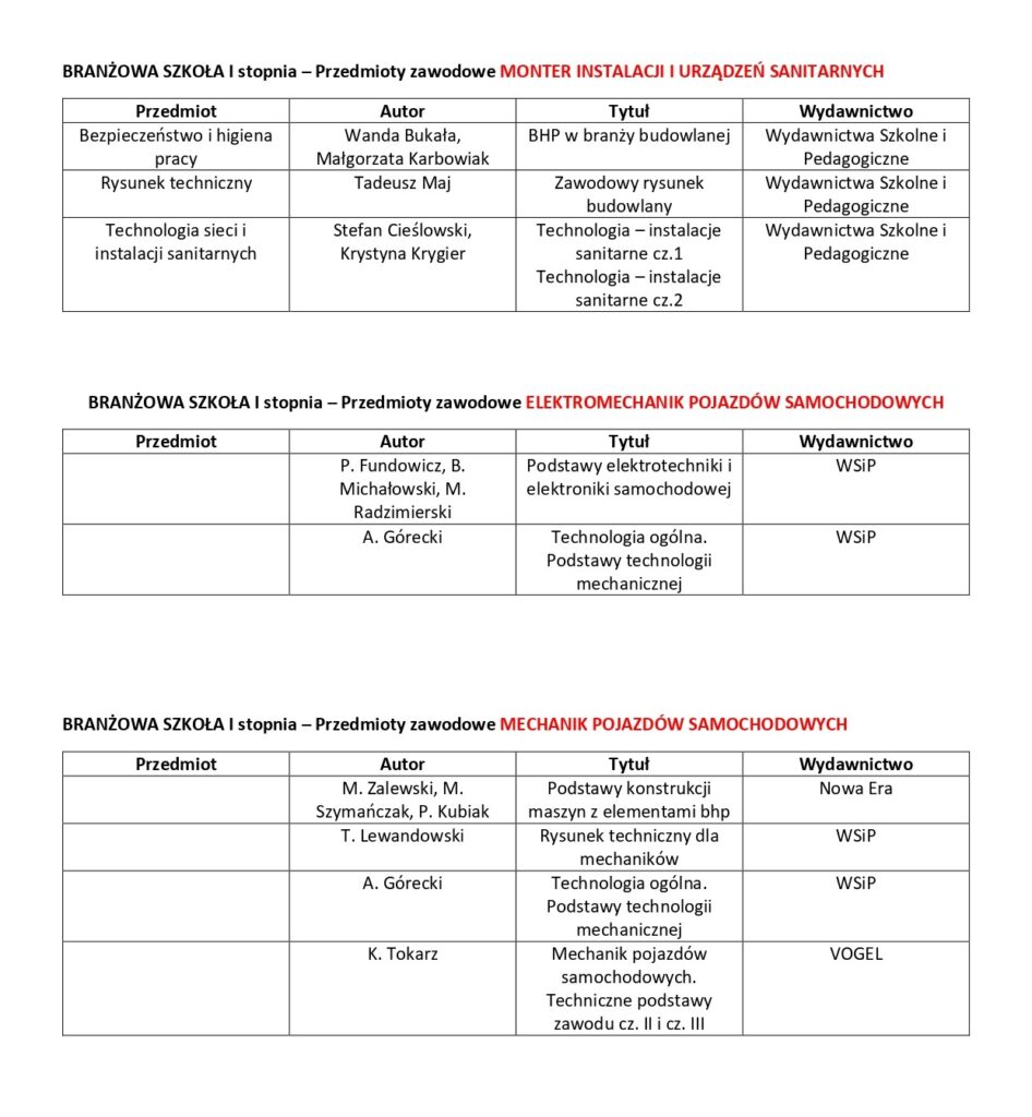 Wykaz podręczników do Szkoły Branżowej I Stopnia