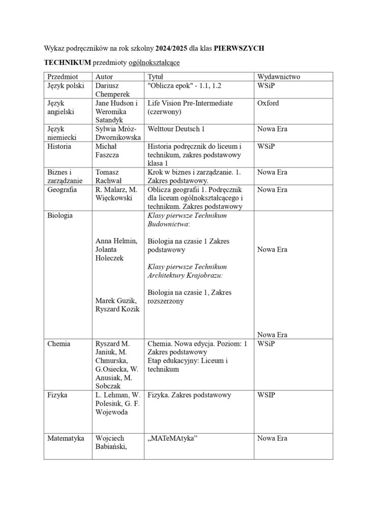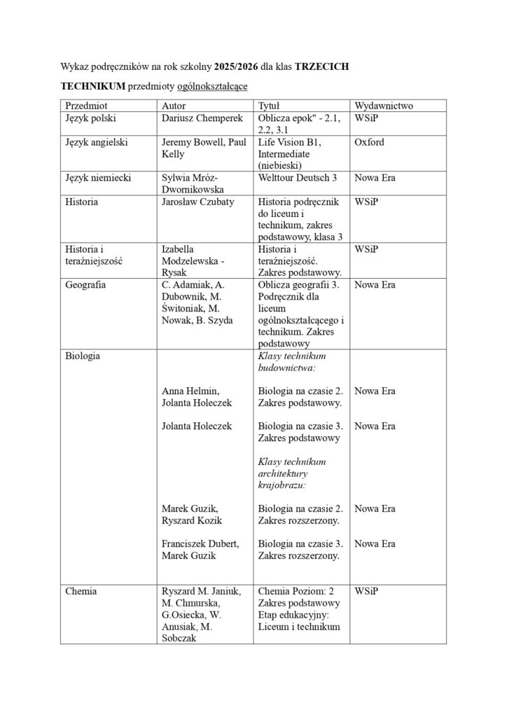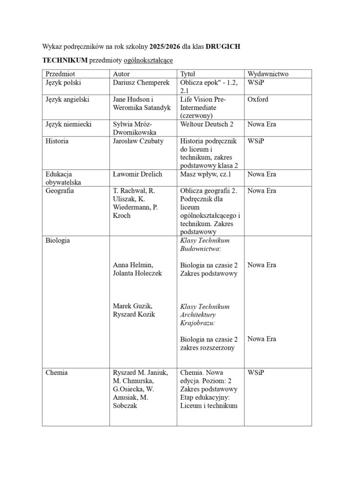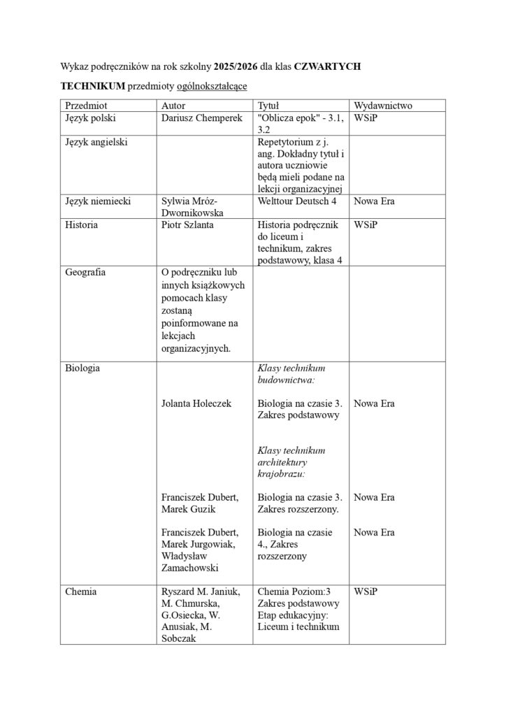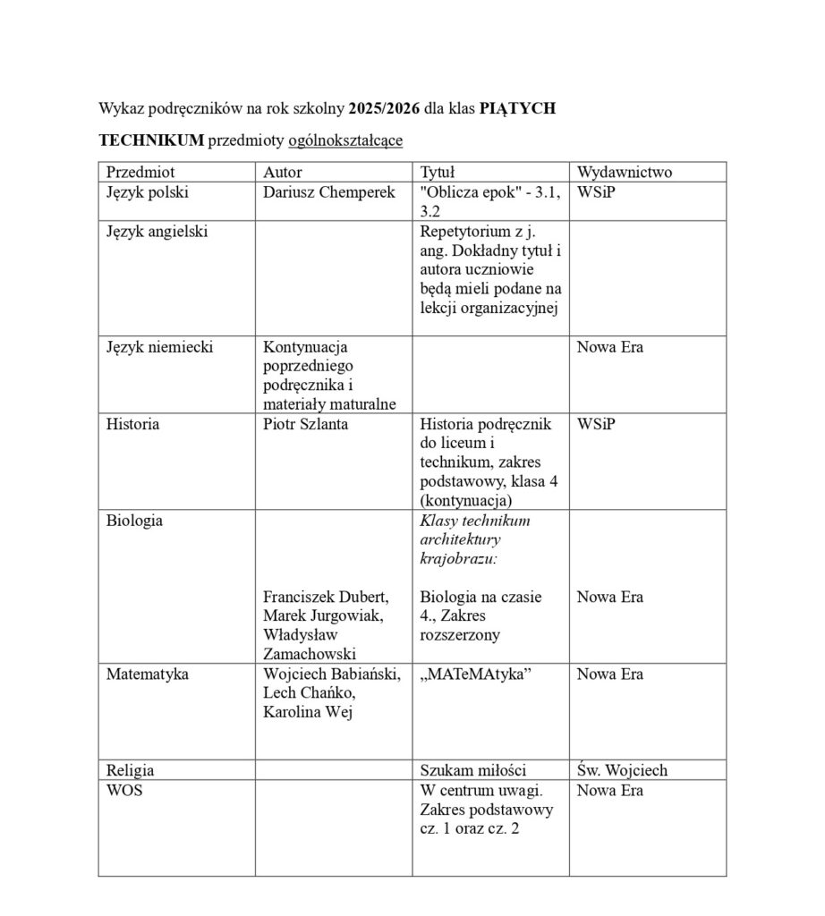 Wykaz podręczników na rok szkolny 2025 / 2026
