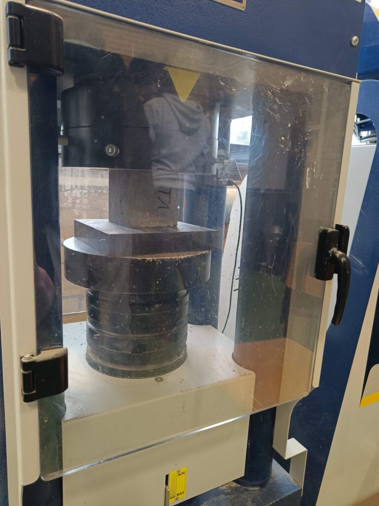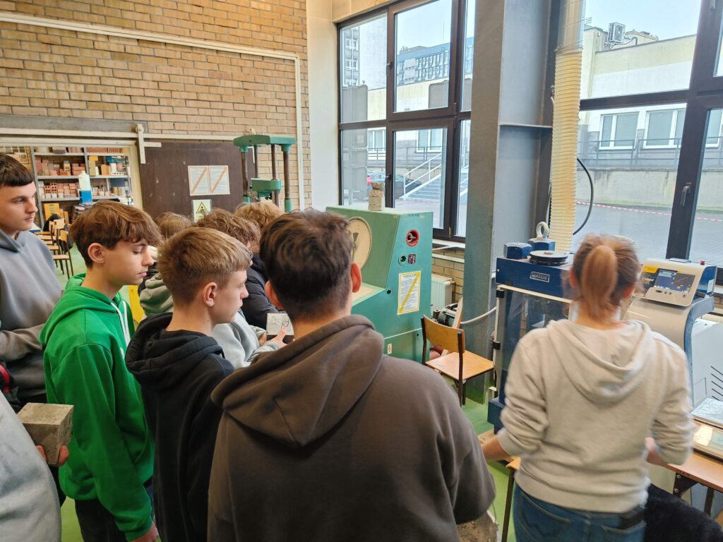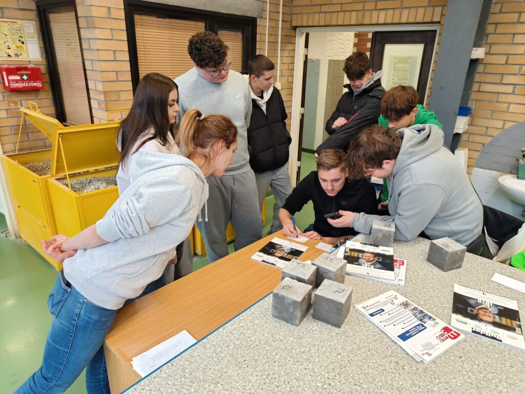 Dokładnie po 28 dniach od pierwszych warsztatów uczniowie klasy 3c Technikum Budownictwa ponownie odwiedzili Politechnikę Poznańską, aby kontynuować zajęcia w Laboratorium Materiałów Budowlanych i Technologii Betonu. Tym razem celem wizyty było zbadanie wytrzymałości wykonanych przez uczniów próbek betonowych, zgodnie z obowiązującymi normami.