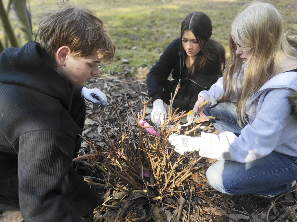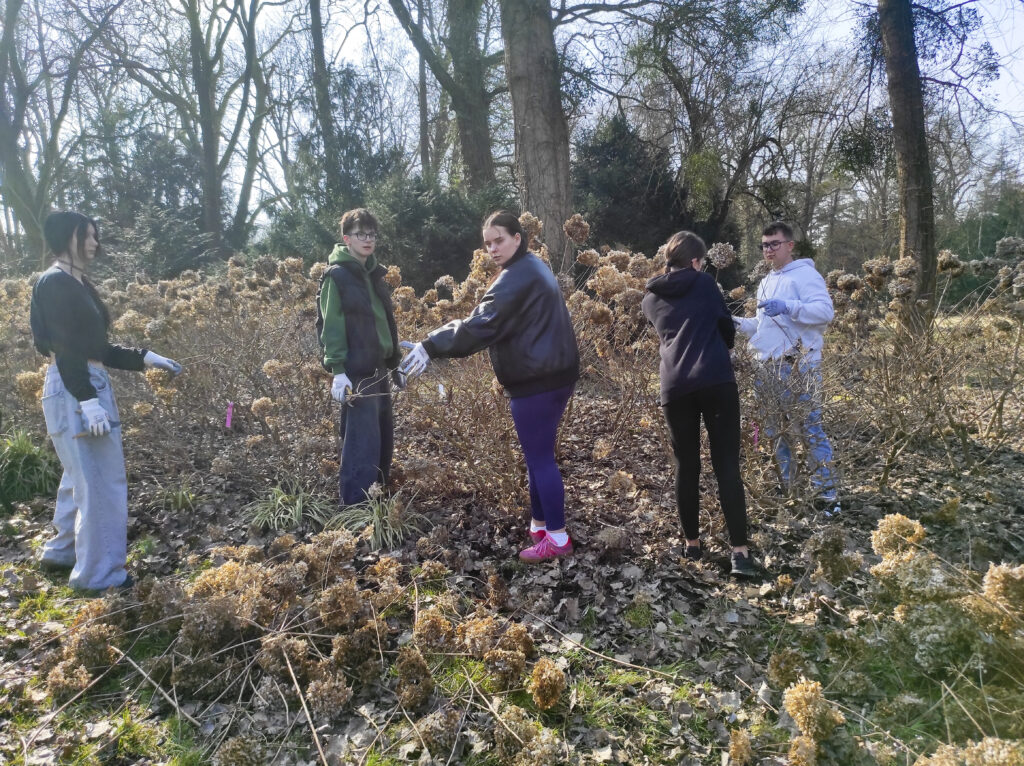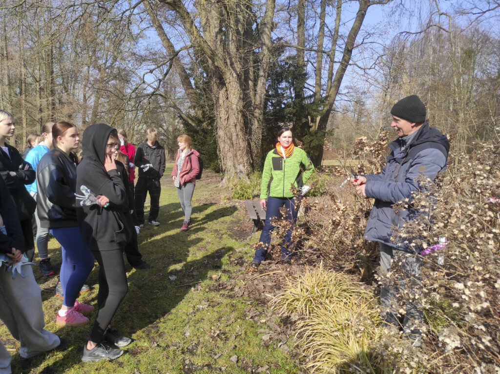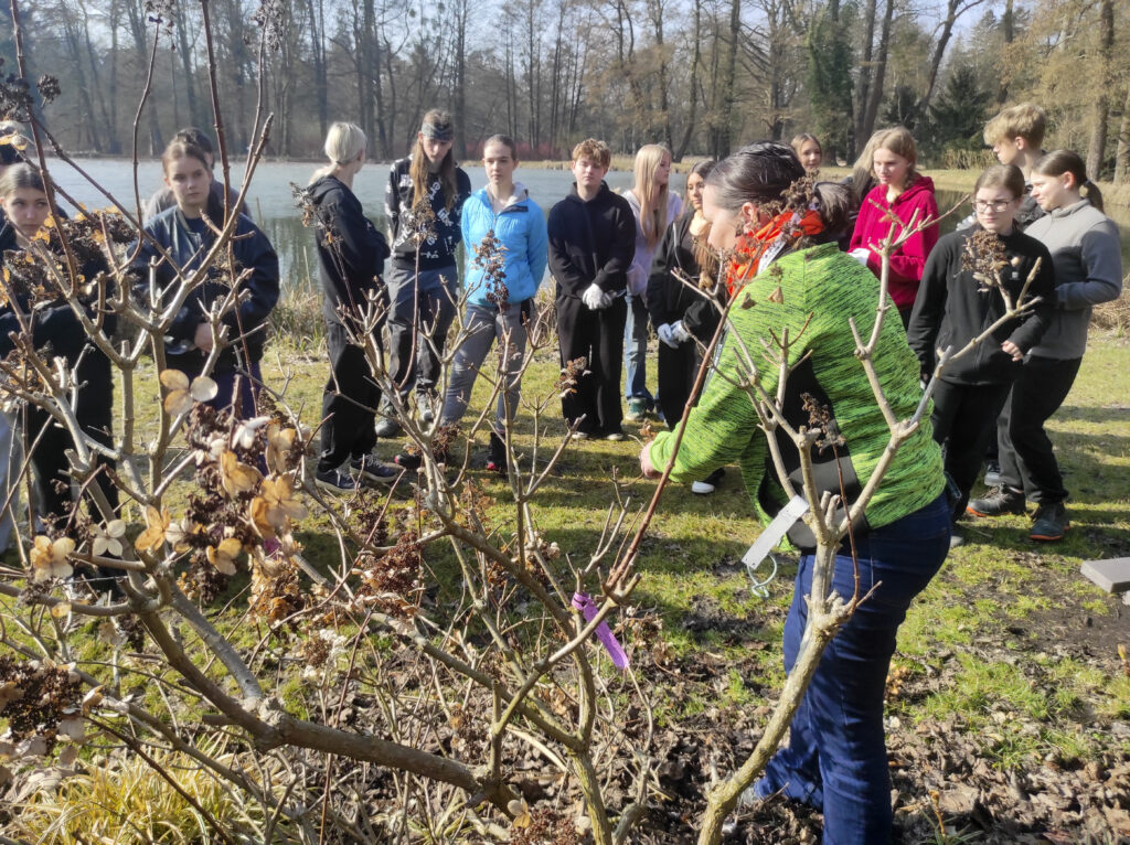 Warsztaty przeprowadziła pani Kierownik Arboretum i Lasu Doświadczalnego w Kórniku dr inż. Kinga Nowak, a tematem przewodnim było prawidłowe przycinanie różnych gatunków hortensji – ogrodowych, bukietowych, krzewiastych oraz hortensji otulonych. Podczas zajęć uczniowie poznali zasady cięcia poszczególnych gatunków tych roślin i dowiedzieli się jakie są ich wymagania siedliskowe.